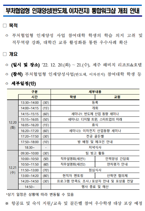이차전지산업 기술인력양성사업단에서는 아래와 같이 2022 부처 협업형 인재양성사업 통합 워크샵을 모집하오니 학생들의 많은 참여 부탁드립니다.