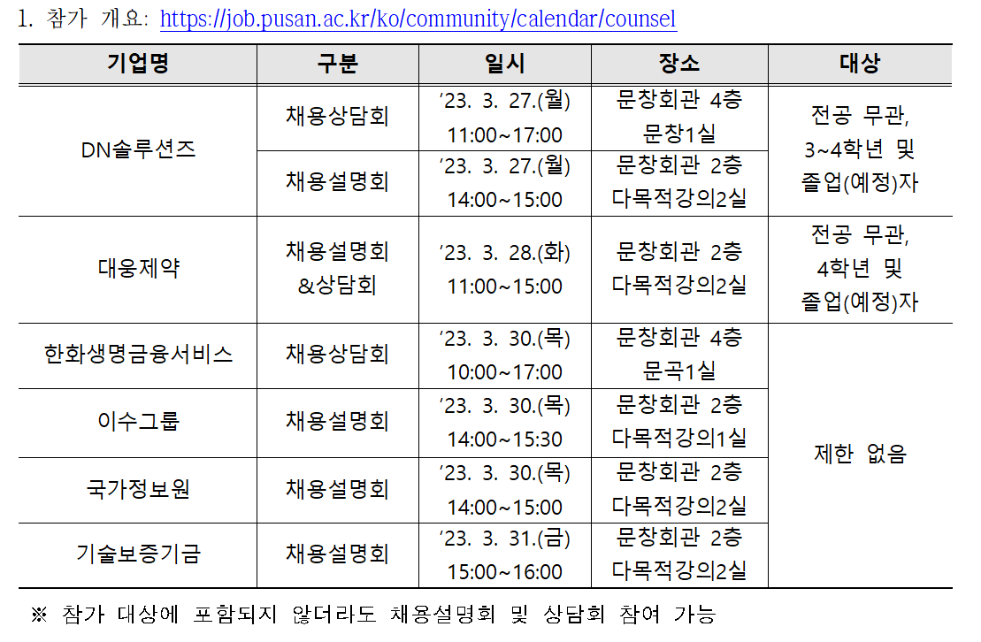 [공고] DN솔루션즈, 대웅제약, 한화생명금융서비스, 이수그룹, 국가정보원, 기술보증기금의 2023 상반기 채용설명회 및 상담회 일정